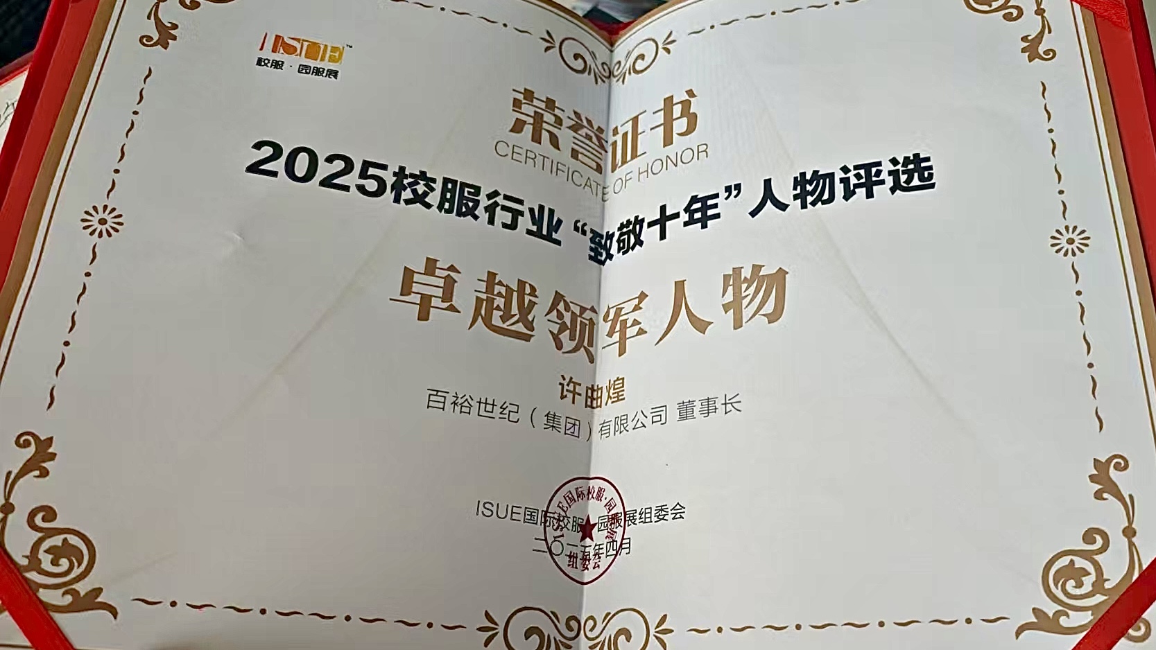 百裕集團董事長(cháng)許曲煌先生憑借其在校服行業(yè)的卓越領(lǐng)導力、創(chuàng )新實(shí)踐與深遠貢獻,榮膺“致敬十年·卓越領(lǐng)軍人物”稱(chēng)號。這一榮譽(yù)不僅是對其個(gè)人成就的高度認可,更是對百裕集團深耕校服領(lǐng)域、推動(dòng)行業(yè)高質(zhì)量發(fā)展的集體褒獎。