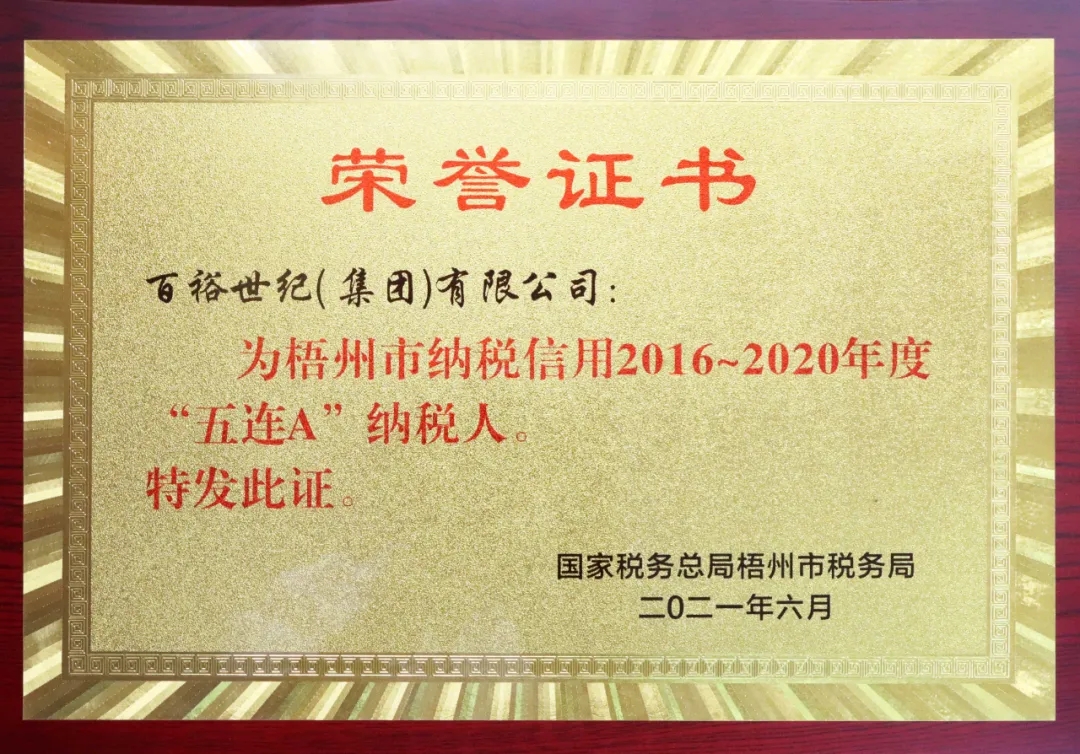 2021年6月,百裕世紀被國家稅務(wù)總局梧州市稅務(wù)局評定為梧州市納稅信用2016-2020年度“五連A”納稅人榮譽(yù)稱(chēng)號,并頒發(fā)證書(shū)。