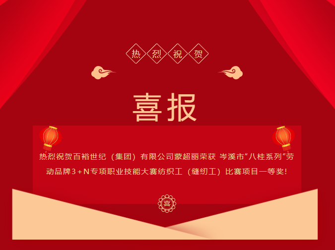 百裕世紀 (集團)有限公司線(xiàn)下車(chē)間職工超麗榮獲紡織工 (縫工)比賽項目的一等獎;羅婷婷、陳杏娟2位職工榮獲二等獎;梁鳳、羅獻鳳、覃廣英、莫清云、廖芬藝5位職工榮獲三等獎;陳海蘭、陳志平、張紅潔等12名職工榮獲優(yōu)勝獎。