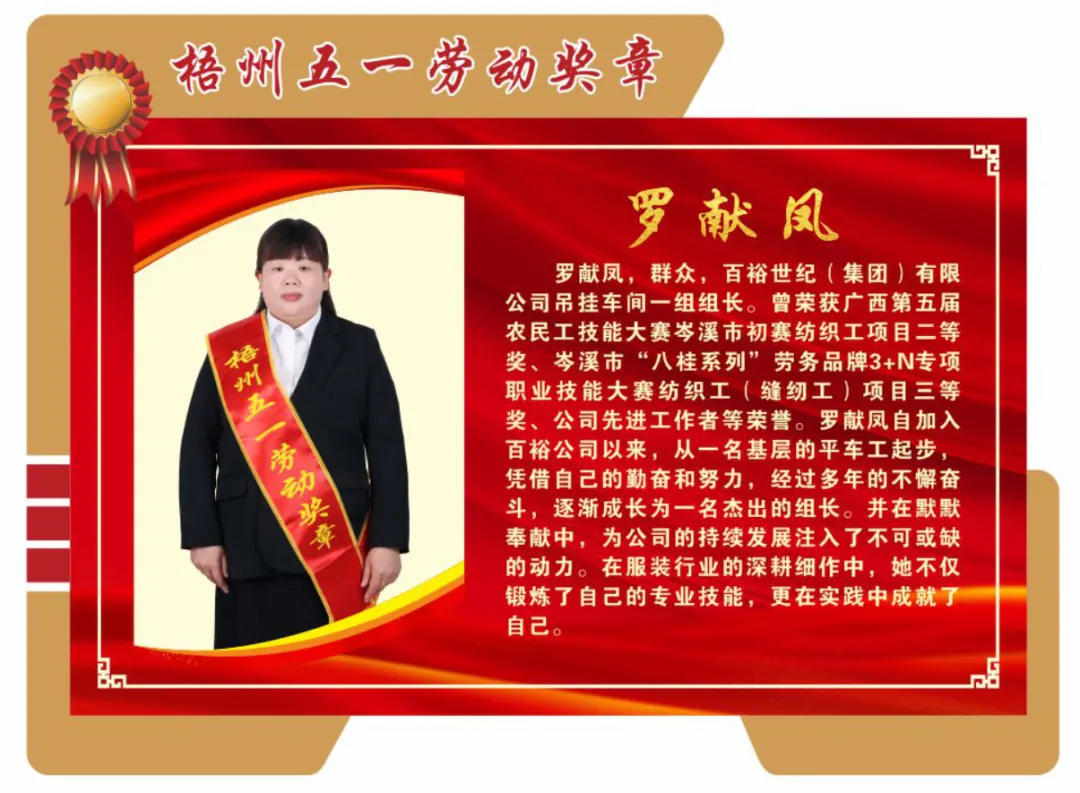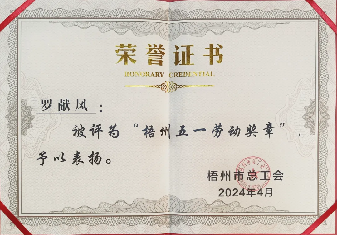 4月26日,梧州市總工會(huì )印發(fā)《梧州市總工會(huì )關(guān)于表?yè)P2024年梧州五一勞動(dòng)獎和梧州工人先鋒號的通報》,百裕世紀(集團)有限公司羅獻鳳同志榮獲2024年“梧州五一勞動(dòng)獎?wù)隆薄?/span>