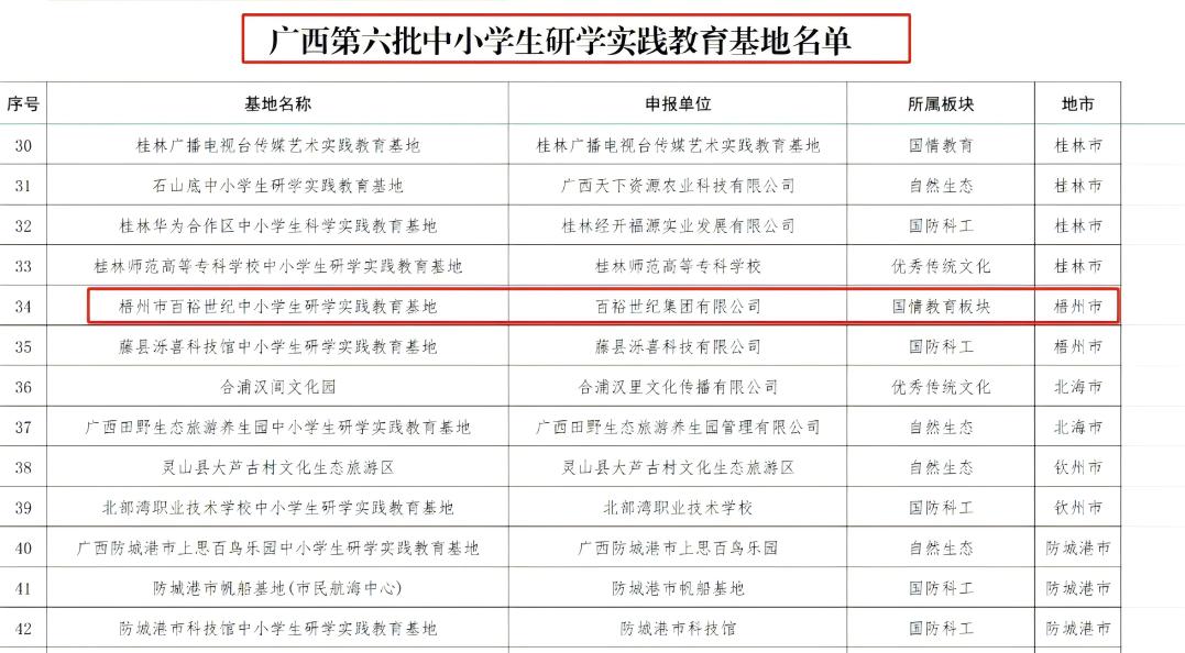 根據《自治區教育廳關(guān)于開(kāi)展2024年全區中小學(xué)生研學(xué)實(shí)踐教育系列評選活動(dòng)的通知》(桂教基教〔2024〕13號)要求,自治區教育廳組織各地開(kāi)展廣西第六批中小學(xué)生研學(xué)實(shí)踐教育基(營(yíng))地和2024年中小學(xué)生研學(xué)實(shí)踐教育精品課程(線(xiàn)路)申報推薦工作。百裕世紀(集團)有限公司入選廣西第六批中小學(xué)生研學(xué)實(shí)踐教育基地名單。